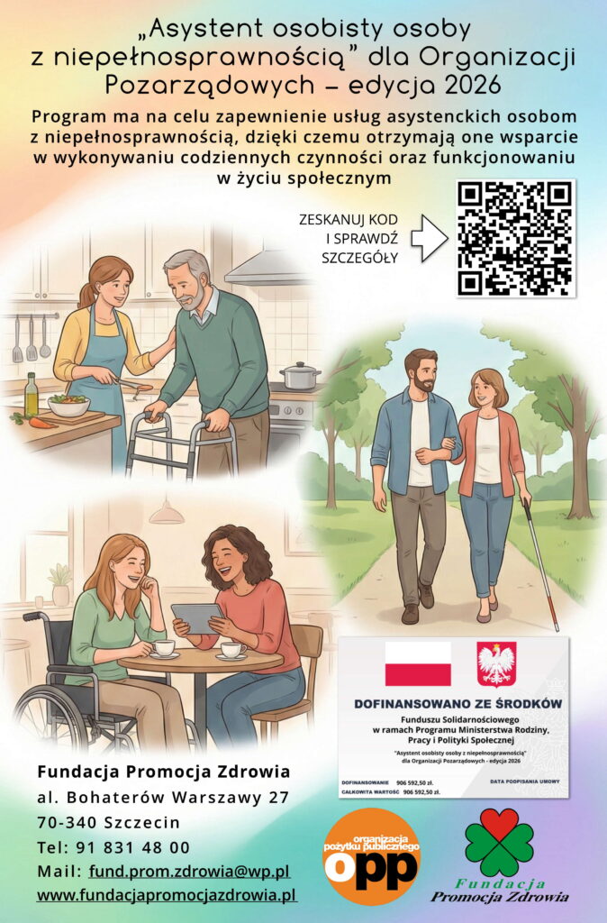 Program„Asystent osobisty osoby z niepełnosprawnością” dla Organizacji Pozarządowych – edycja 2026 realizowany przez Fundację Promocja Zdrowia ma na celu zapewnienie usług asystenckich osobom z niepełnosprawnością. Fundacja Promocja Zdrowia prowadzi nabór wniosków od osób zainteresowanych udziałem w programie. Poniżej publikujemy aktualne informacje o projekcie. Okres realizacji: 01.01.2026 – 31.12.2026.