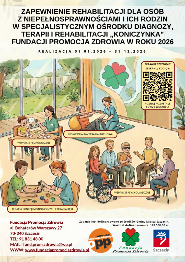 Realizacja zadania polega na zapewnieniu dostępu do rehabilitacji, terapii oraz wsparcia dla 20 osób z niepełnosprawnością, w tym dzieci, młodzieży i dorosłych, będących mieszkańcami Szczecina. Dodatkowo wsparcie kierowane jest do dzieci do 3. roku życia zagrożonych niepełnosprawnością. Działania te są realizowane w Specjalistycznym Ośrodku Diagnozy, Terapii i Rehabilitacji „Koniczynka”