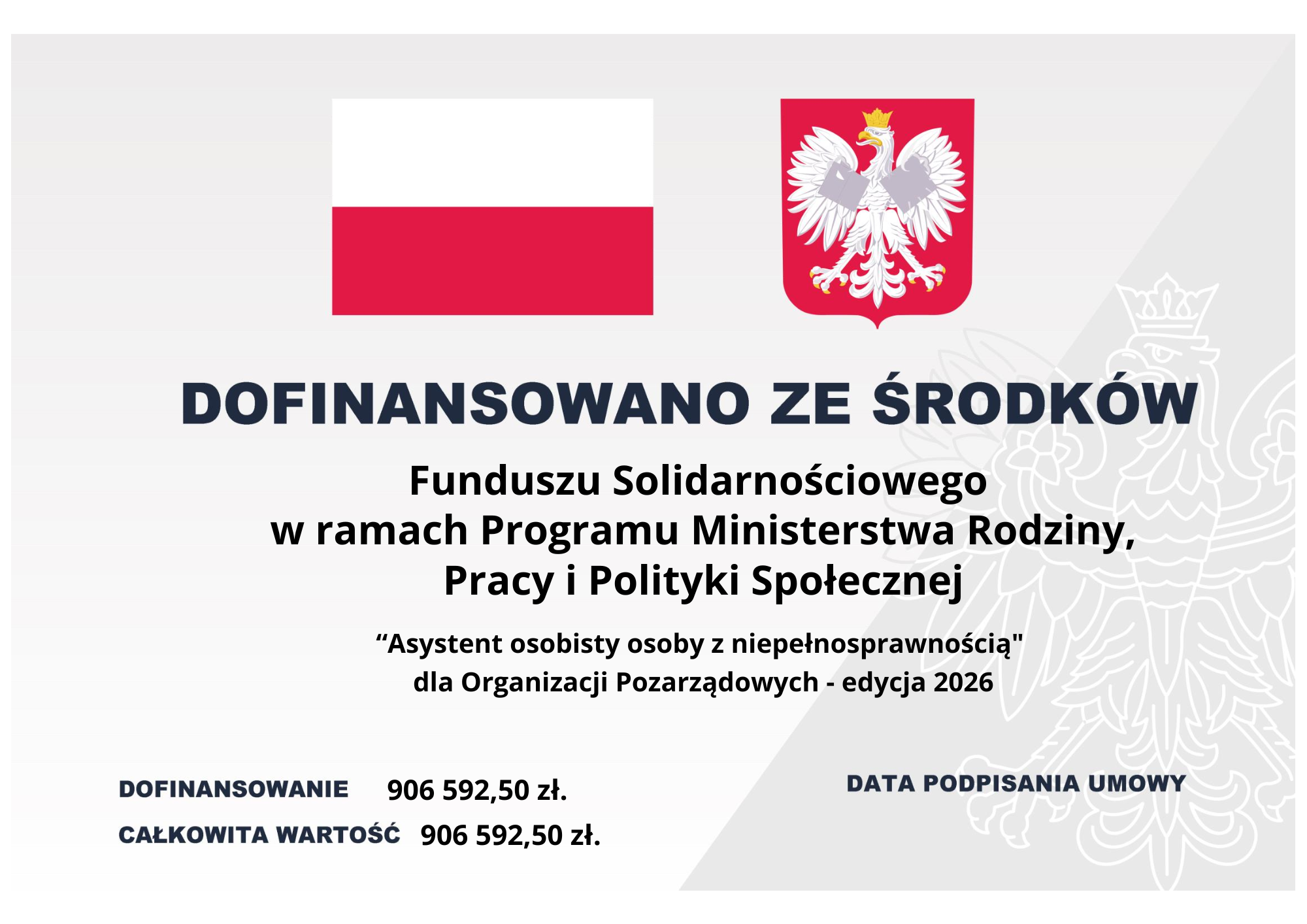 Zadanie jest finansowane ze środków Funduszu Solidarnościowego w ramach Programu Ministerstwa Rodziny, Pracy i Polityki Społecznej „Asystent osobisty osoby z niepełnosprawnością” dla Organizacji Pozarządowych – edycja 2026. Wartość dofinansowania: 906 592,50 zł.