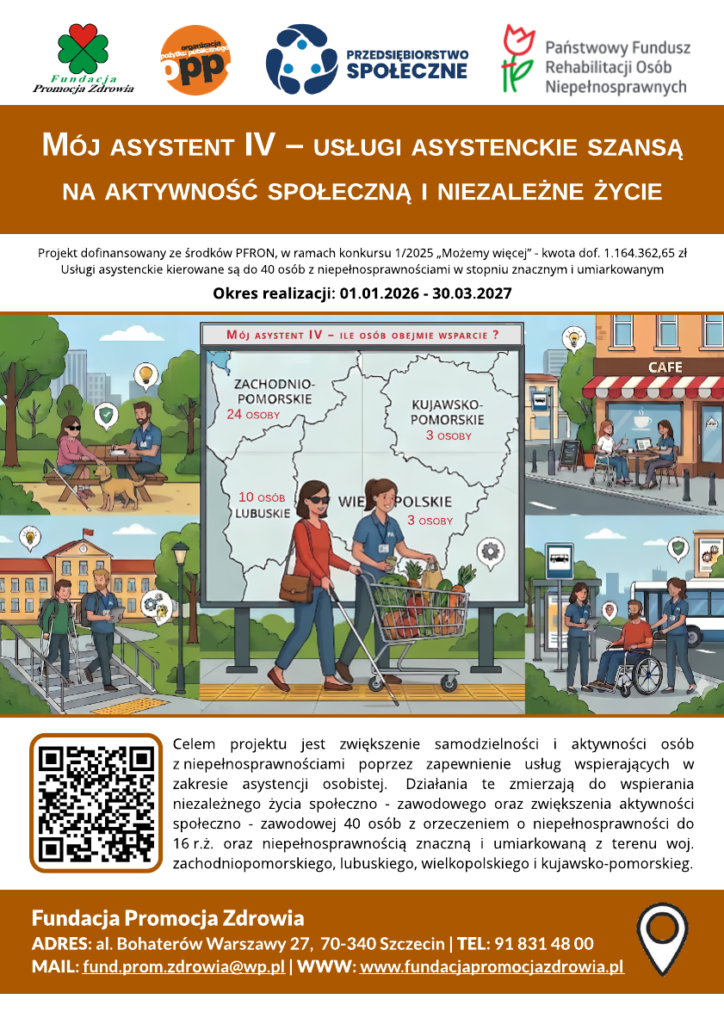 OPIS PROJEKTU: Projekt ma na celu zwiększenie samodzielności i aktywności osób z niepełnosprawnościami poprzez zapewnienie usługi asystencji osobistej. Usługi asystenckie skierowane są do osób ze znacznym i umiarkowanym stopniem niepełnosprawności oraz z orzeczeniem o niepełnosprawności zamieszkałych na terenie województwa zachodniopomorskiego, lubuskiego, kujawsko-pomorskiego i wielkopolskiego (bez względu na rodzaj niepełnosprawności). Adresatami pomocy są w szczególności osoby niewidome i niedowidzące oraz z niepełnosprawnością sprzężoną. W ramach projektu nie będą prowadzone usługi opiekuńcze i pielęgniarskie. Wsparcie asystenckie prowadzone będzie przez co najmniej 12 miesięcy. Wsparciem zostanie objętych 40 osób, co pozwoli zapewnić ciągłość usług asystenckich dla beneficjentów objętych wsparciem od 4 lat. Zwiększenie samodzielności w funkcjonowaniu będzie punktem wyjścia do podjęcia dalszej aktywności społecznej i zawodowej oraz wsparciem w pełnieniu ról społecznych.